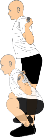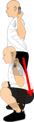 胸を張ったまま、膝と股関節を同時に曲げて、お尻をやや後ろに引き下げるようにしゃがんでいきます。