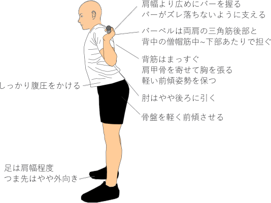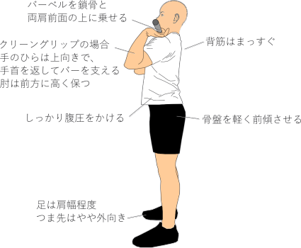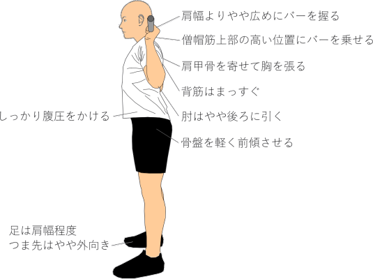 • バーベルを鎖骨と両肩前面にしっかり乗せる