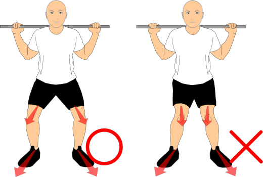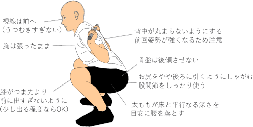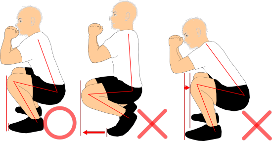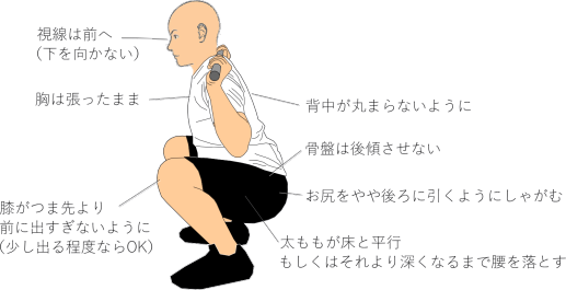 しゃがんだ際に、膝がつま先より前に出すぎないように注意しましょう(少し出る程度なら問題なし)。