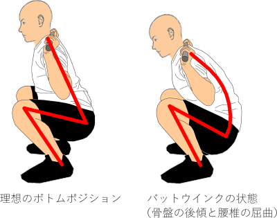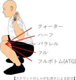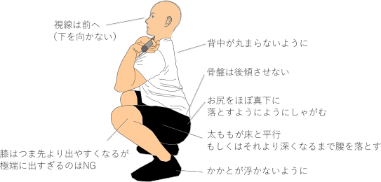 しゃがむ深さは、太ももが床と平行(パラレル)か、さらに深くヒップラインが落ちる深さ(フル)が理想です。