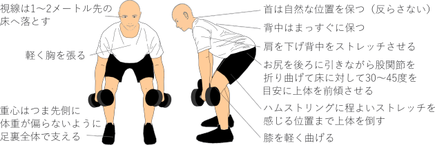 前傾姿勢で動作を行うため、脊柱起立筋や腰まわりに負荷が集中しやすい特徴があります。