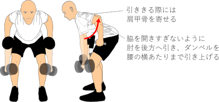 上体を前傾させた姿勢でウエイトを引く動作を通じて、背中全体の筋肉を効果的に鍛えることができます。