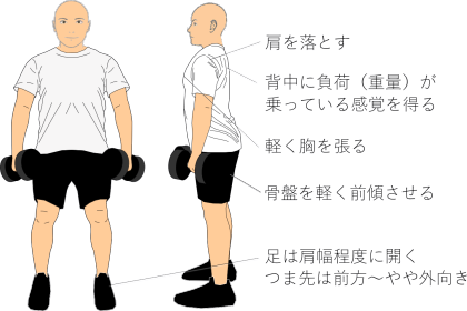 - ダンベルを両手で持ち、足幅は肩幅程度に開いて立ちます。