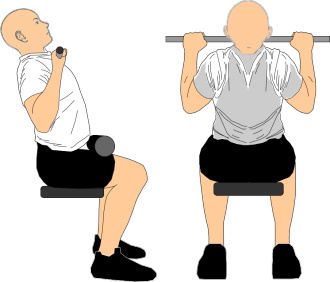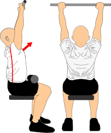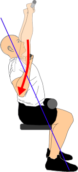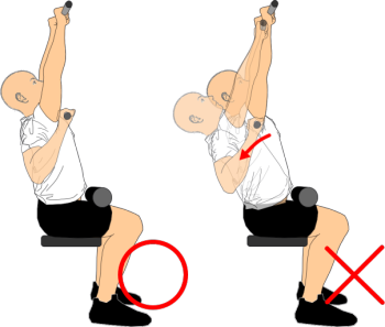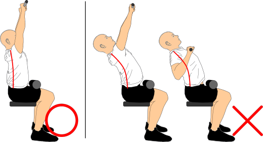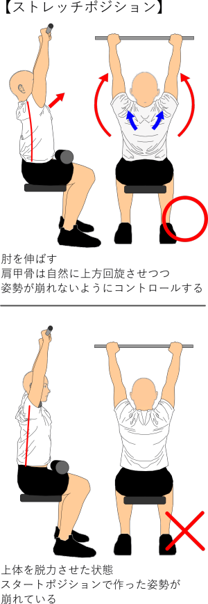 肘は伸ばしていく際は、肩甲骨は自然に上方回旋させつつ体幹は安定させて、スタートポジションで作った『上体を軽く後傾させ、胸を張って上背部を軽く反らし、胸が斜め上を向く姿勢』が崩れないようにしましょう。