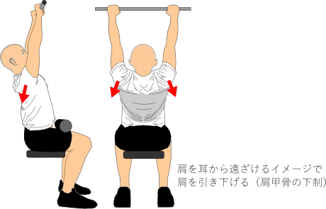 バーを元の位置に戻す際、肩甲骨は腕を上げる動きに伴って自然に上方回旋・挙上が起こります。