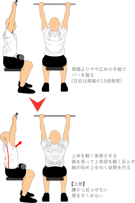 - バーは胸の上部付近に向けて下ろす