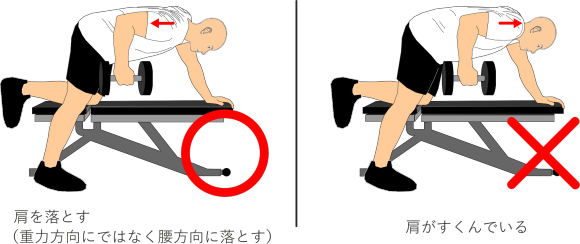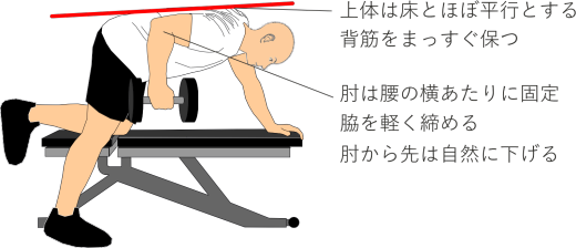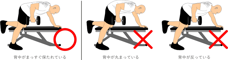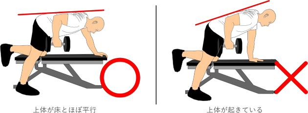 (例:右手でダンベルを持つなら、左手・左膝をベンチに置く) - 上体を床とほぼ平行になるように前傾し、背筋をまっすぐ保つ