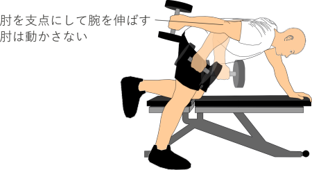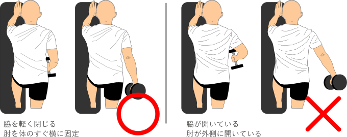 - 息を吐きながら肘を支点にして、前腕を後方へ肘を伸ばし切るまで上げる
