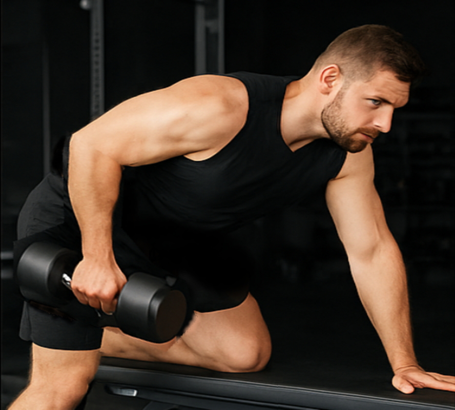 ダンベルキックバックは、上体を前傾させ、肘を体の横に固定したまま腕を後方に伸ばすトレーニングです。